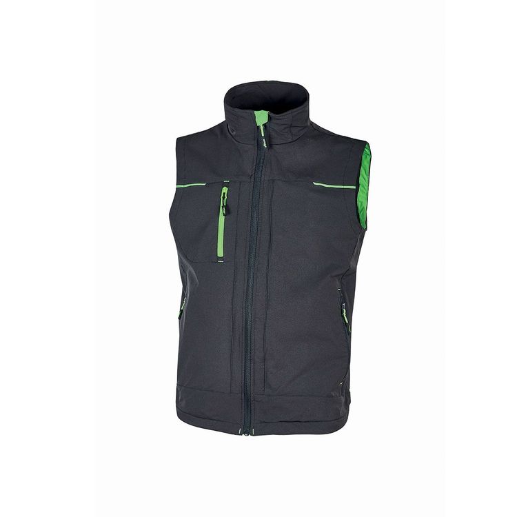 90% NYLON • 10% ELASTANE • 260 g/m² U-4 vest (U-Power 4-way stretch) – very comfortable, durable, soft against the skin, water-repellent, breathable, and quick-drying. Features two front pockets and a cell phone pocket on the chest, all with zippers. Reflective trim at the back of the collar. Two large inner pockets. Shaped hem. This vest can be combined with the Atom trousers.