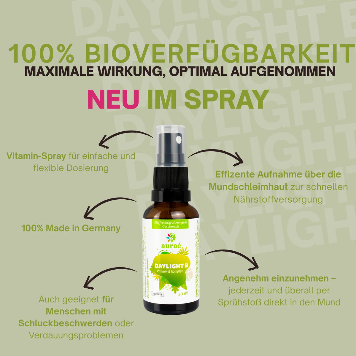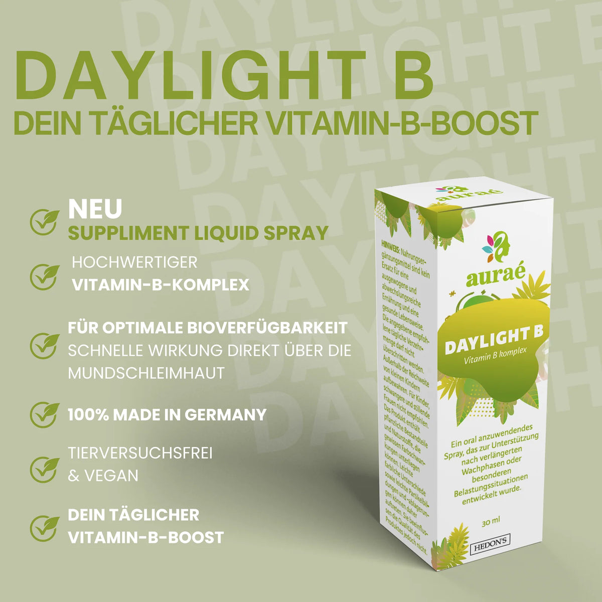 DayLight B steht für höchste Premiumqualität – Made in Germany. Jede Portion wird unter streng kontrollierten Bedingungen hergestellt und entspricht den höchsten Qualitätsstandards. Wir setzen auf sorgfältig ausgewählte Inhaltsstoffe, die maximale Wirksamkeit und Verträglichkeit garantieren. Unser Spray ist frei von künstlichen Farb- und Konservierungsstoffen, sodass nur das in deinem Körper landet, was er wirklich braucht. Außerdem ist DayLight B vegan und glutenfrei – perfekt abgestimmt auf einen bewussten, modernen Lifestyle.