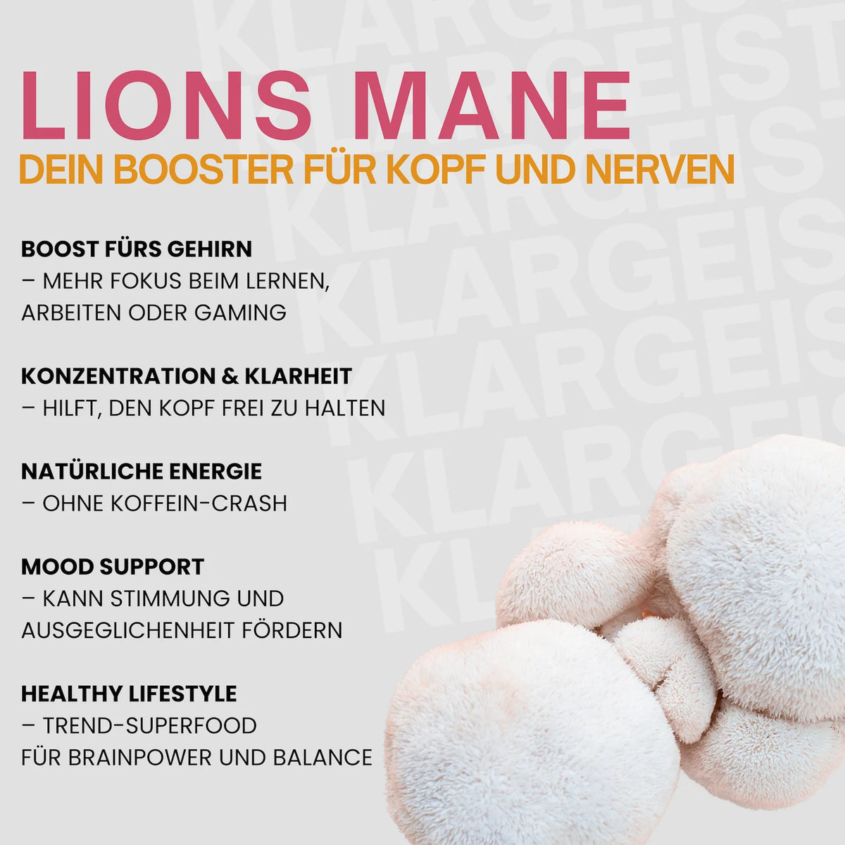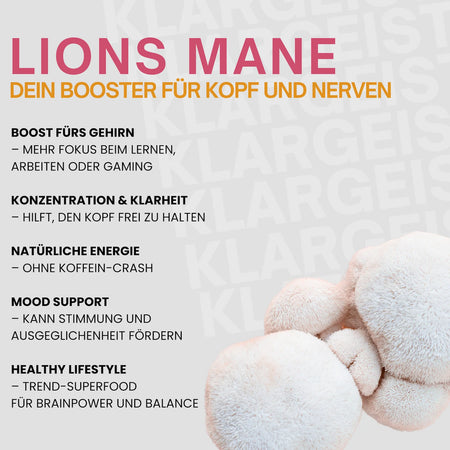 Unsere sorgfältig zusammengestellte Formel vereint das Beste aus der Natur: den einzigartigen Extrakt des Lion’s Mane Pilzes, der in der traditionellen Medizin seit Jahrhunderten geschätzt wird, und ein ausgewogenes Spektrum an B-Vitaminen, die eine wichtige Rolle im Energiestoffwechsel und der normalen Funktion des Nervensystems spielen.