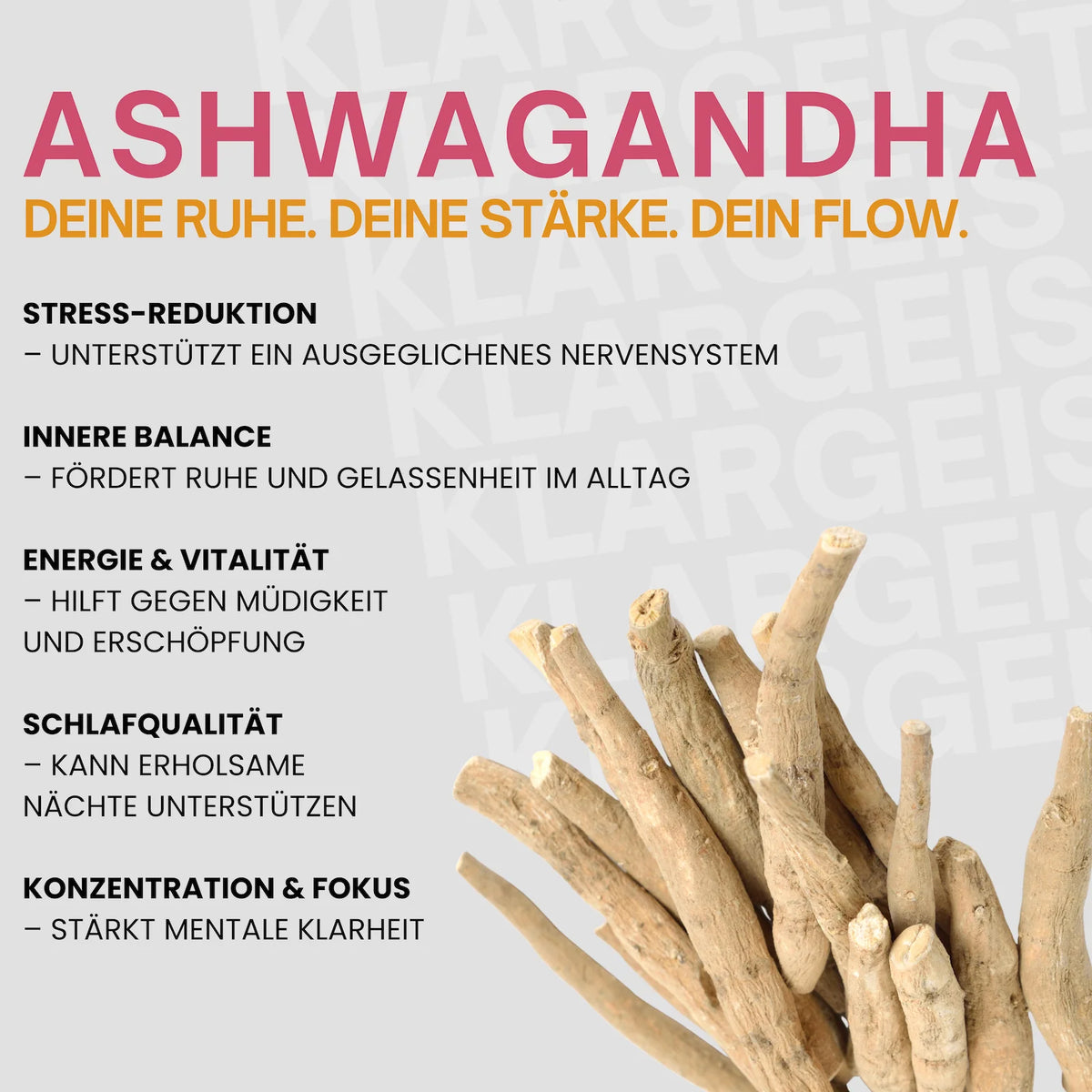 Ashwagandha (Withania somnifera) ist eine traditionsreiche Pflanze, die seit Jahrhunderten in der ayurvedischen Kultur geschätzt wird. Ihr Wurzelextrakt wird heute in modernen Rezepturen verarbeitet und ist bekannt für seinen charakteristischen, leicht erdigen Geschmack. In Kombination mit einem ausgewogenen Lebensstil kann Ashwagandha ein besonderes Element deiner täglichen Routine sein.