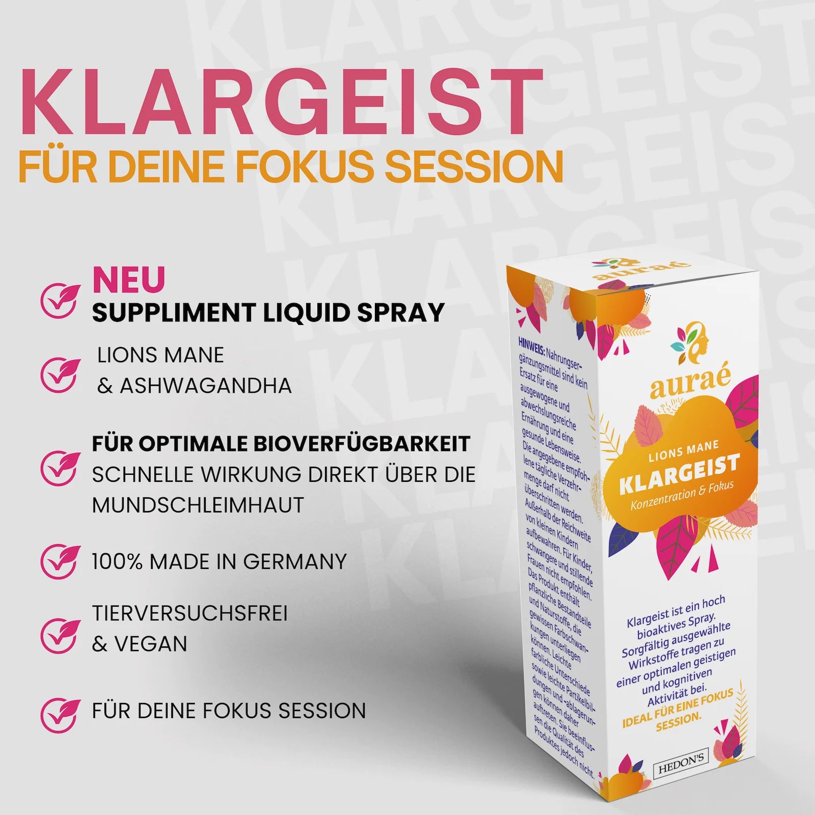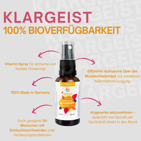 Klargeist – Konzentration & Fokus ist ein hochbioaktives Spray mit sorgfältig ausgewählten Inhaltsstoffen. Entwickelt, um dich in deinem Alltag zu begleiten!