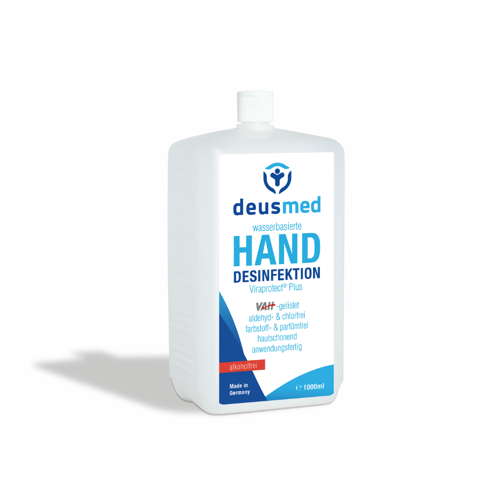Hygienische Desinfektion von deusmed schont die Haut wie auch die Oberflächen zudem sind all unsere Desinfektionsmittel sind "begrenzt viruzid plus"