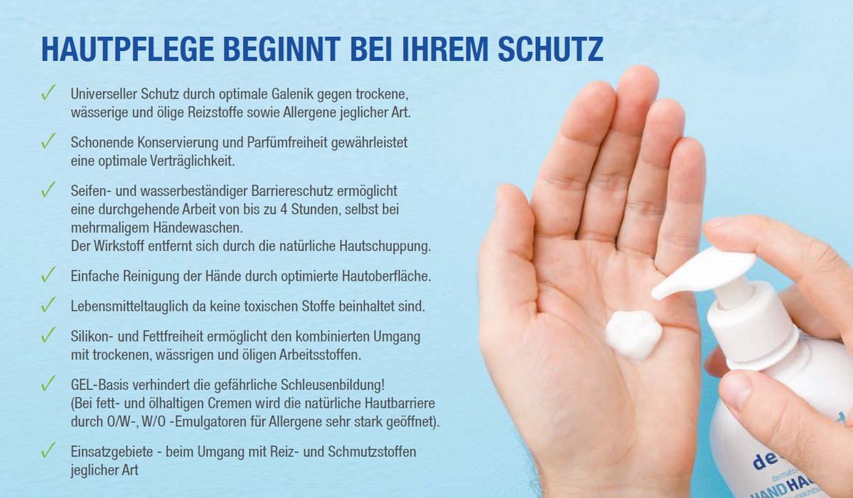 Viele der Funktionen beruhen auf der Grundlage, dass die Hautschutzprodukte von deusmed® keine fettenden Stoffe,