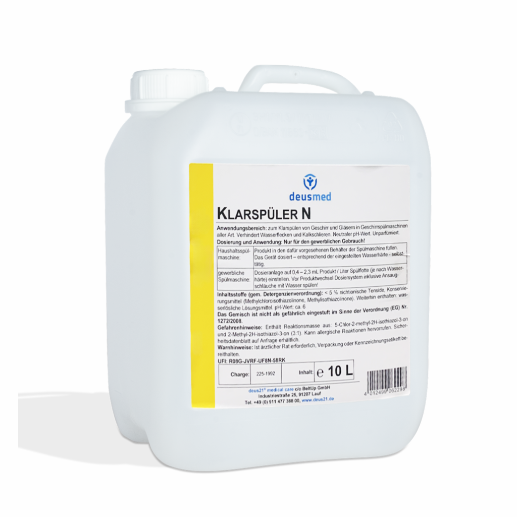 Der Deusmed Maschinenklarspüler (neutral) ist ein professioneller Klarspüler für Reinigungs- und Desinfektionsautomaten, der für streifenfreie Trocknung und glänzende Oberflächen sorgt – ohne aggressive Säuren.