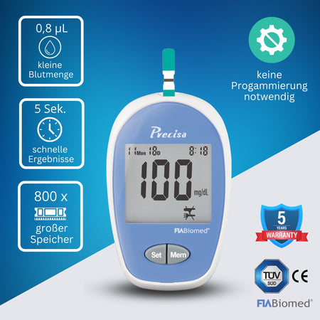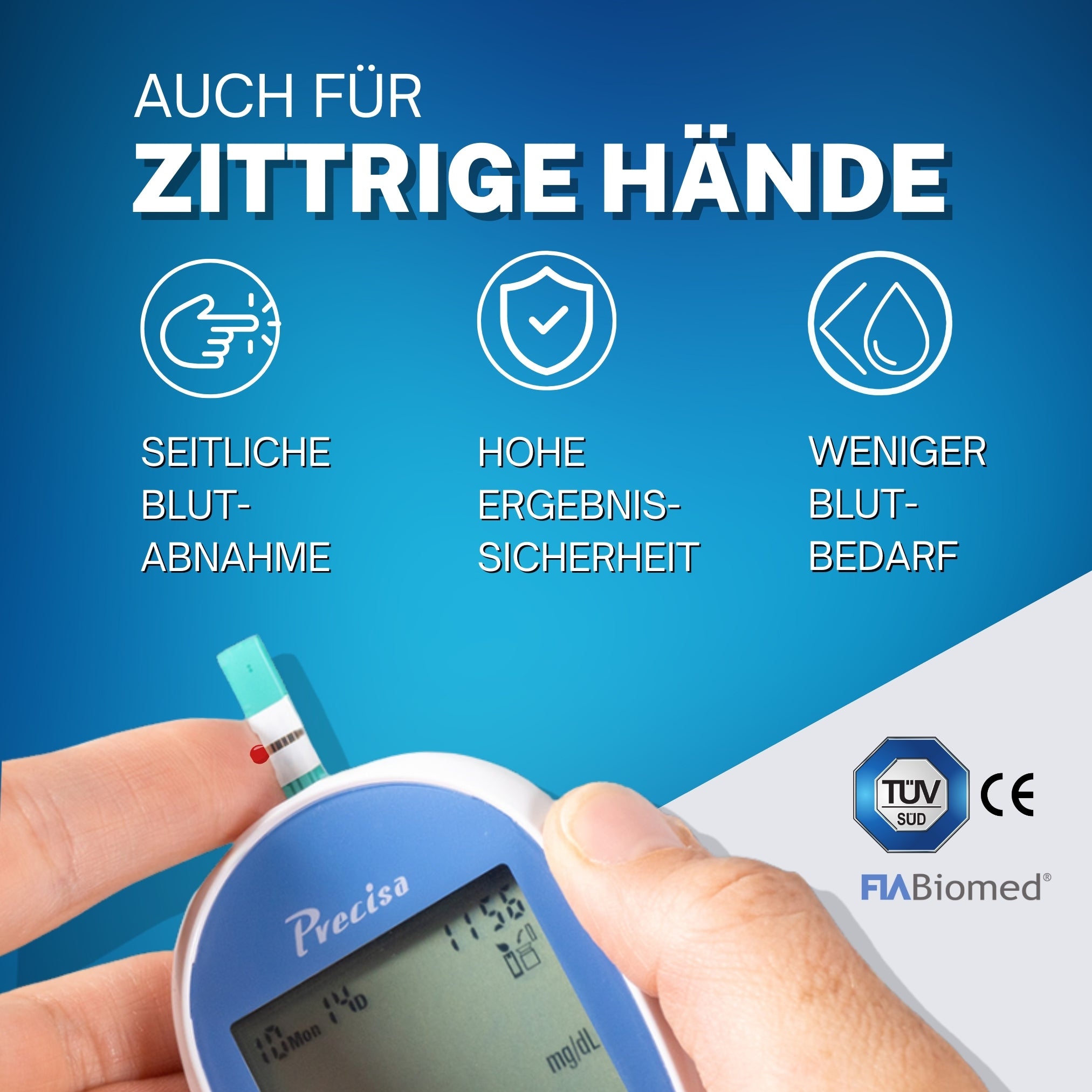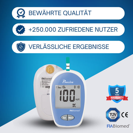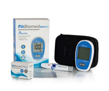 Die FIA Biomed™ Precisa Teststreifen werden zusammen mit dem FIA Biomed™ Precisa Blutzuckermessgerät zur quantitativen Blutzuckermessung mit frischem Kapillarvollblut zur Selbstkontrolle verwendet.