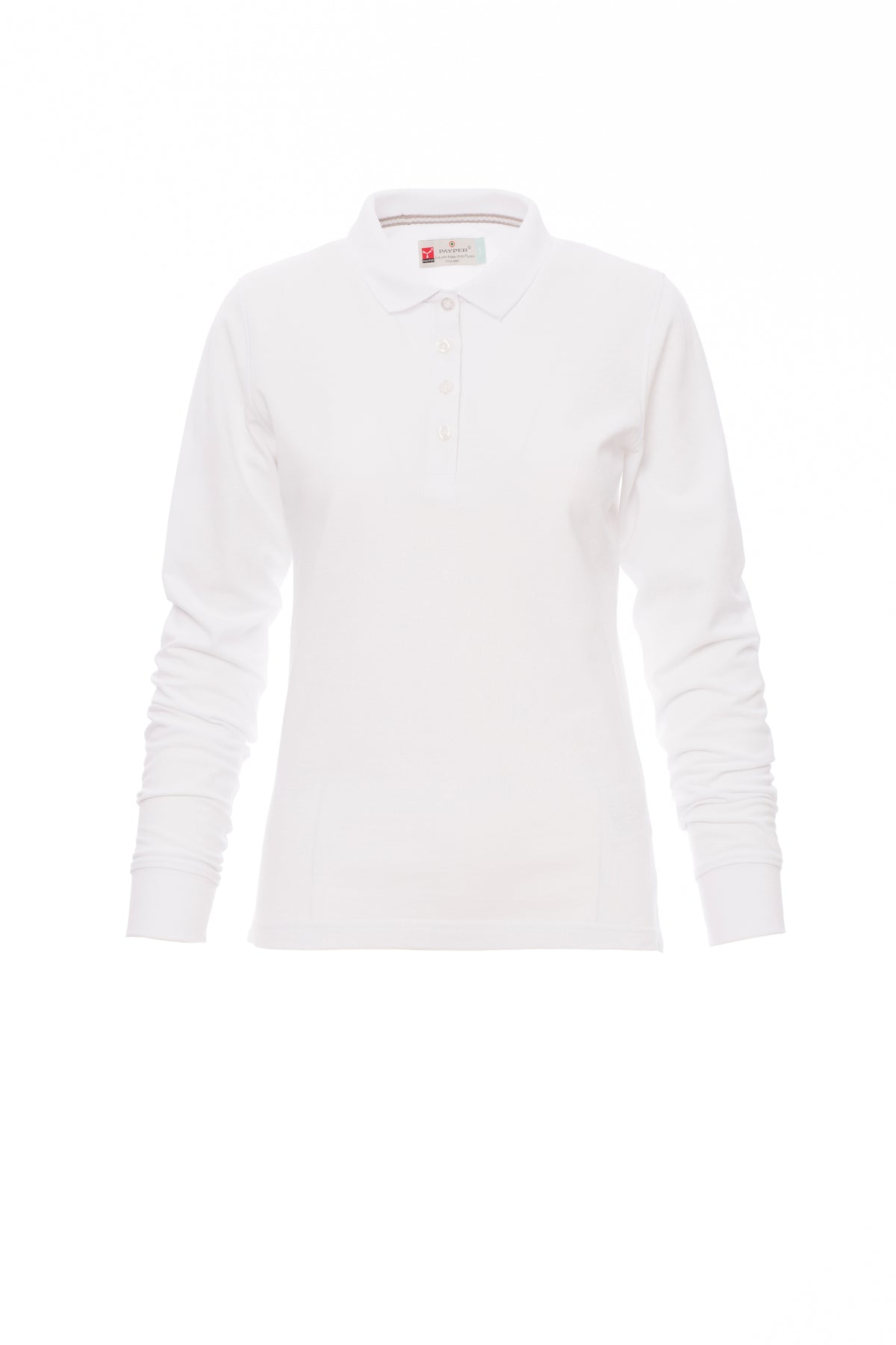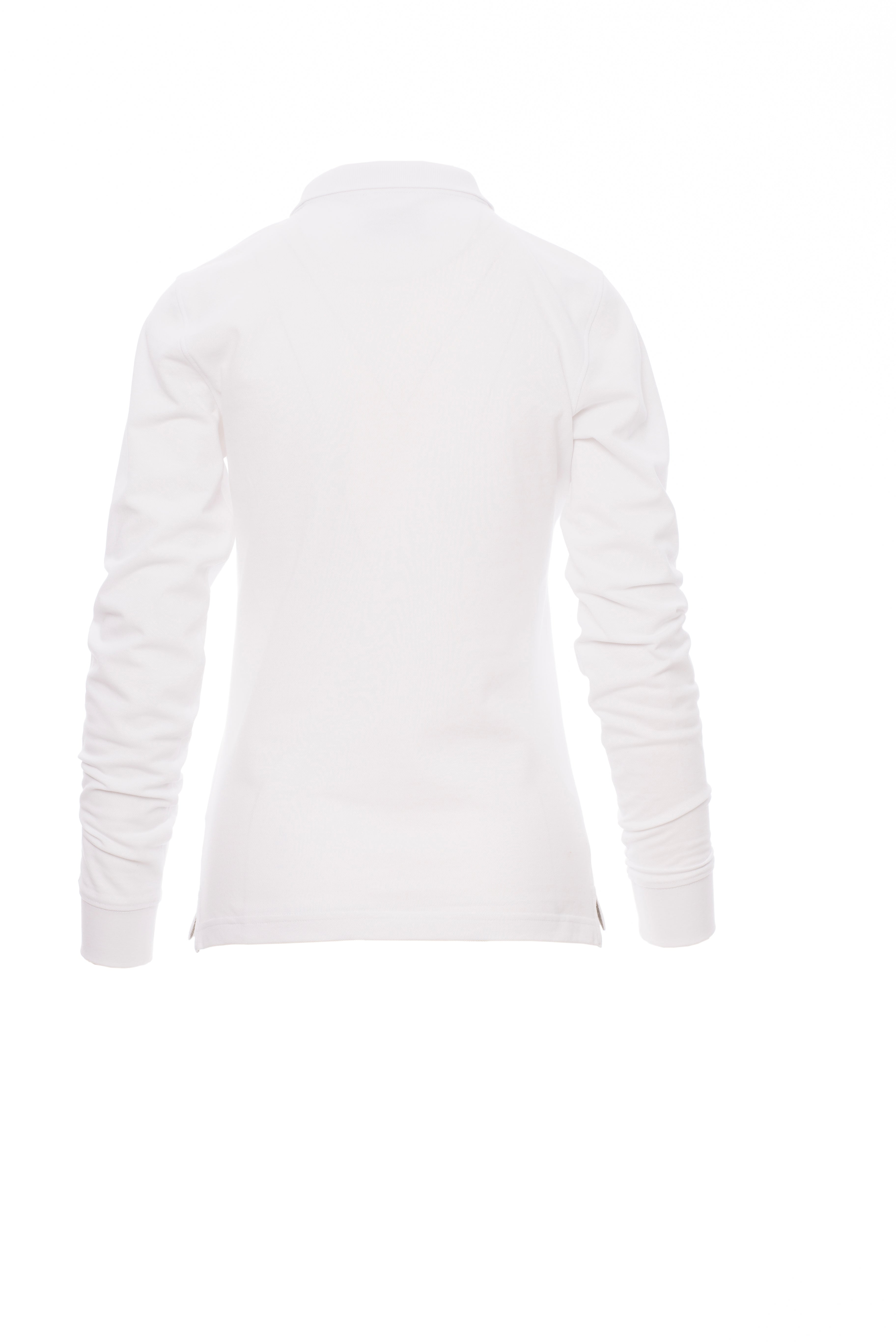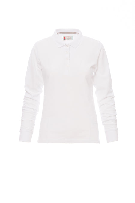 Tailliertes Damen-Poloshirt, langärmelig, mit 4 Knöpfen Ton-in-Ton mit Perlmutteffekt, Kragen und Ärmelrand aus Feinripp, Seitenschlitzen, Nackenband in Kontrastfarbe, Stretchnähten, seitlichem Verstärkungsband, Nackensattel.