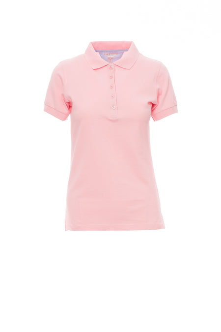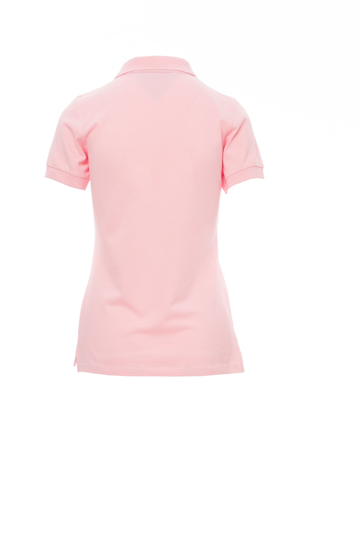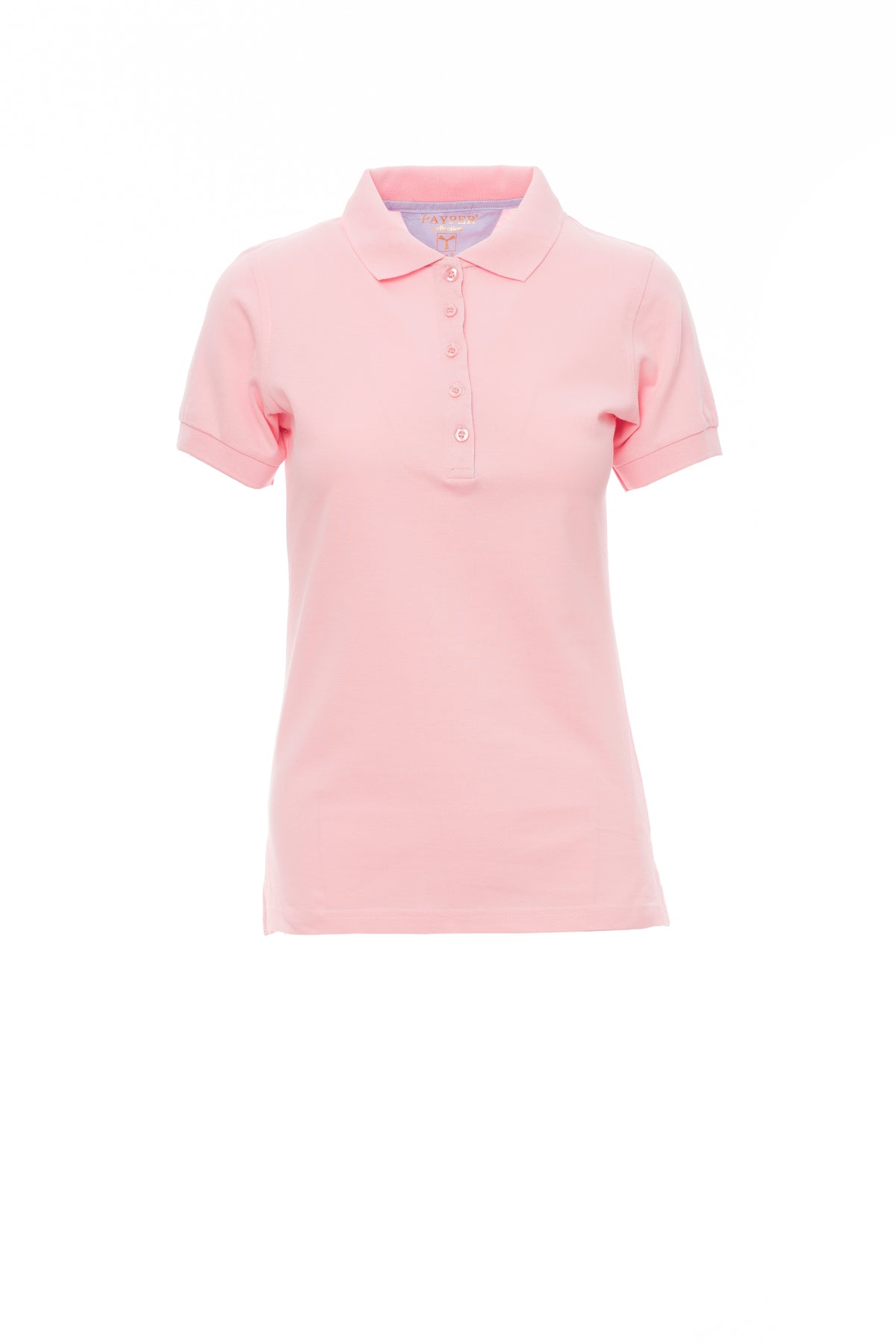 Tailliertes Damen-Poloshirt, kurzärmelig, mit 5 Knöpfen Ton-in-Ton mit Perlmutteffekt, Kragen und Ärmelrand aus Feinripp, dezenten, hellblauen Popeline-Einsätzen an der Krageninnenseite, Knopfleiste und an den Seitenschlitzen, Transfer-Etikett, Nackensattel.
