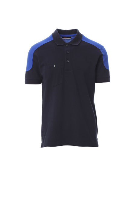 Zweifarbiges Polo-Shirt, kurzärmelig, 3 Knöpfe Ton-in-Ton, Brusttasche mit Stifthalter, Ärmelrand aus Feinripp, Seitenschlitze, Nackenband.