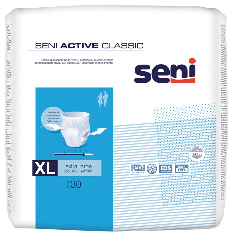 Die hautfreundlichen Seni Active Classic Inkontinenzslips lassen sich leicht wie gewöhnliche Unterwäsche an- und ausziehen. Ein Nässeindikator informiert Sie über einen Wechselbedarf.